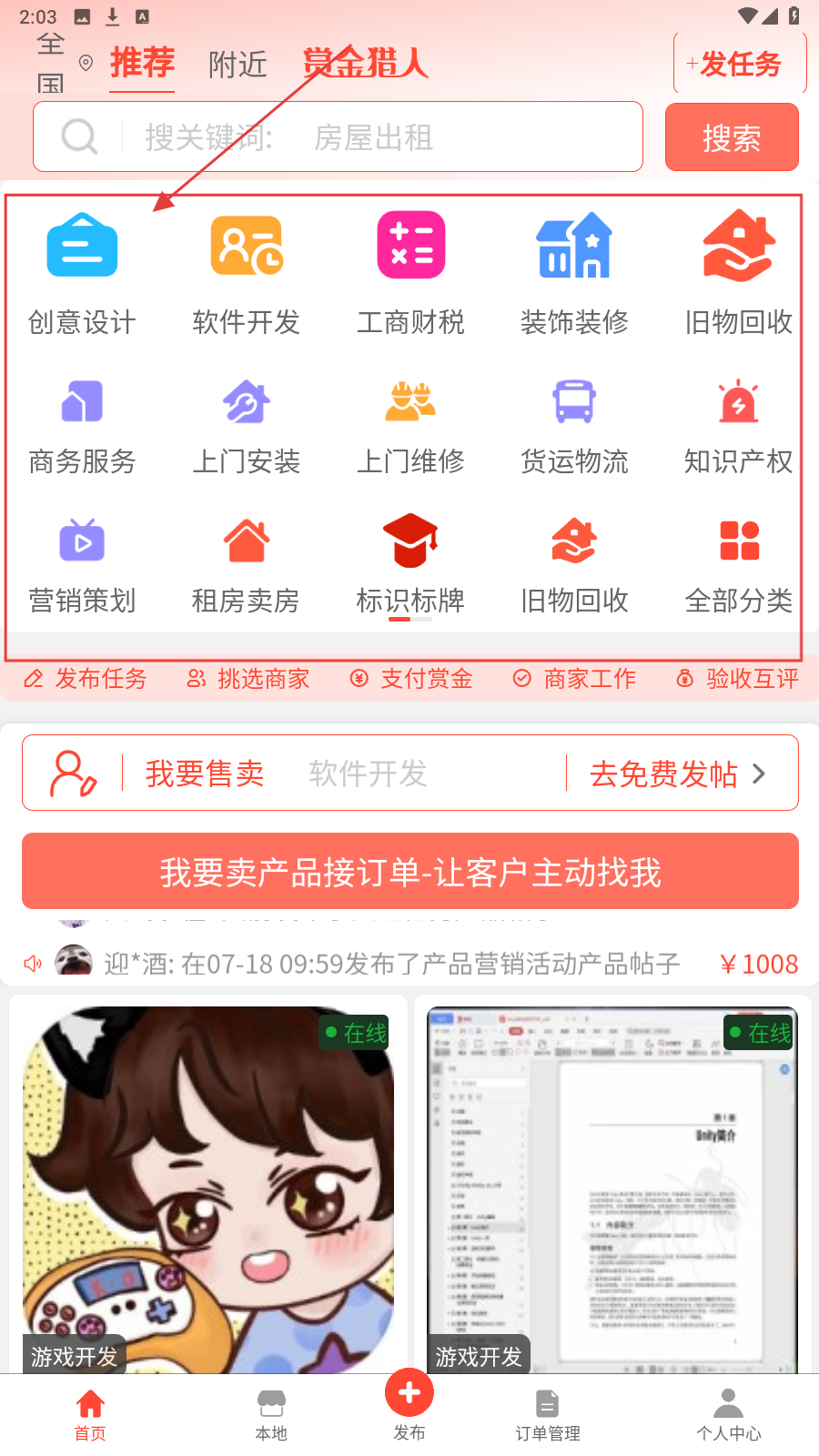 1、进入首页,选【创意设计】分类,查找所需服务商家。