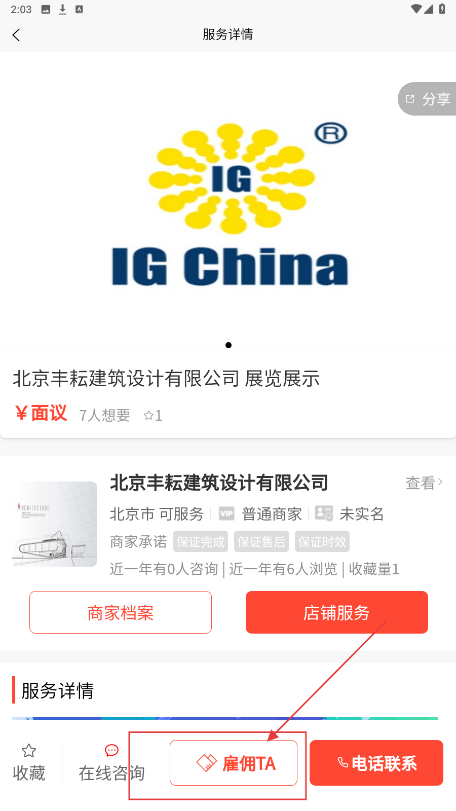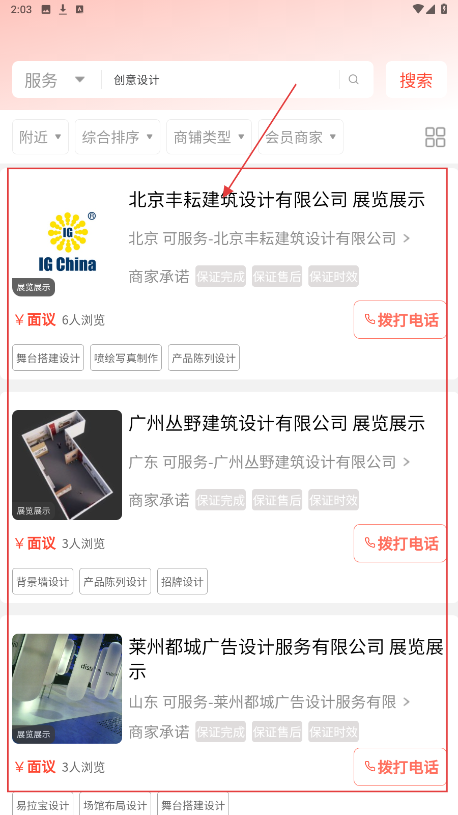 2、在分类结果,点【北京丰耘建筑设计有限公司-展览展示】,看服务详情。
