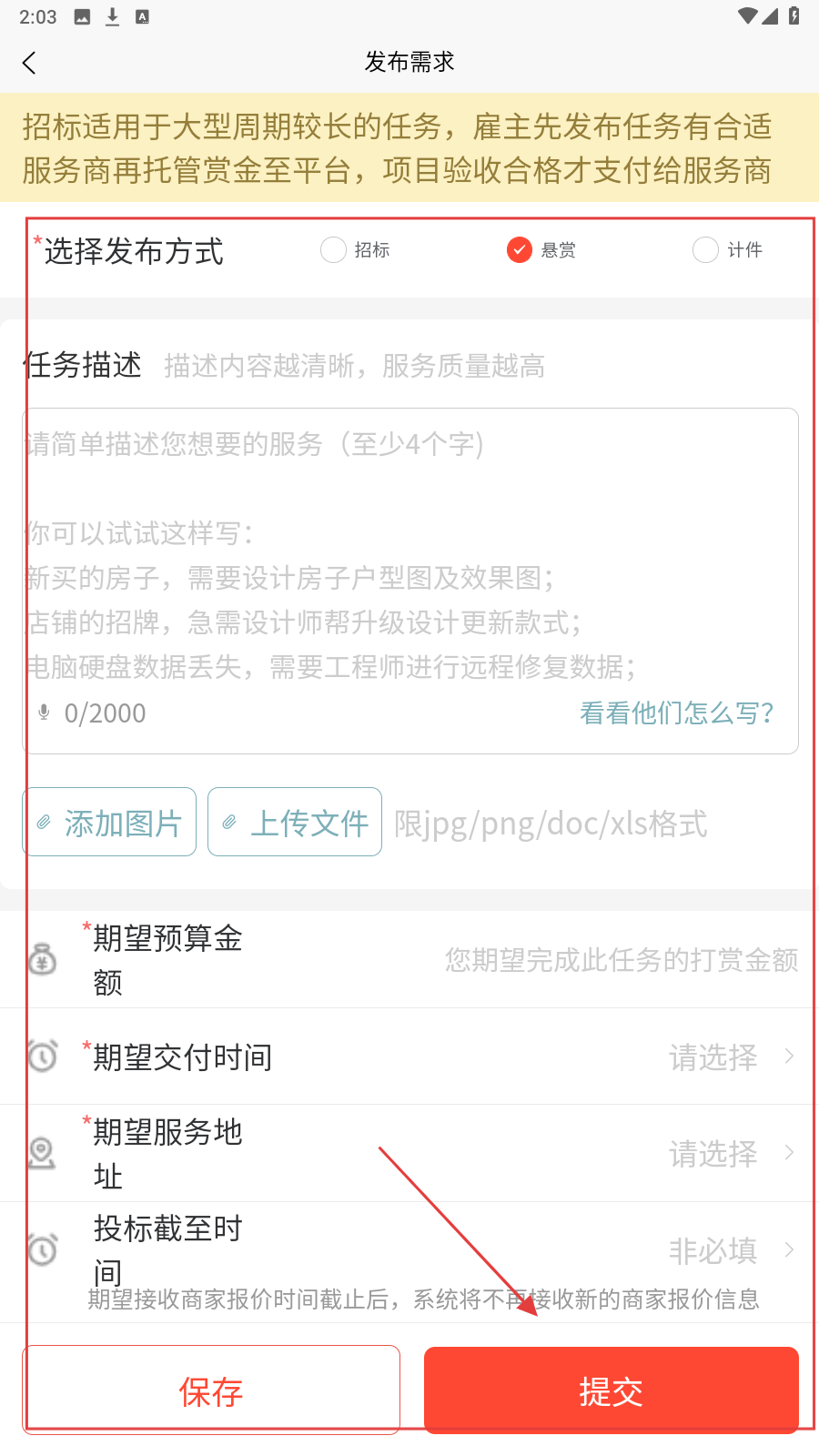 4、填发布需求,选【悬赏】等方式,完善信息后点【提交】发布。