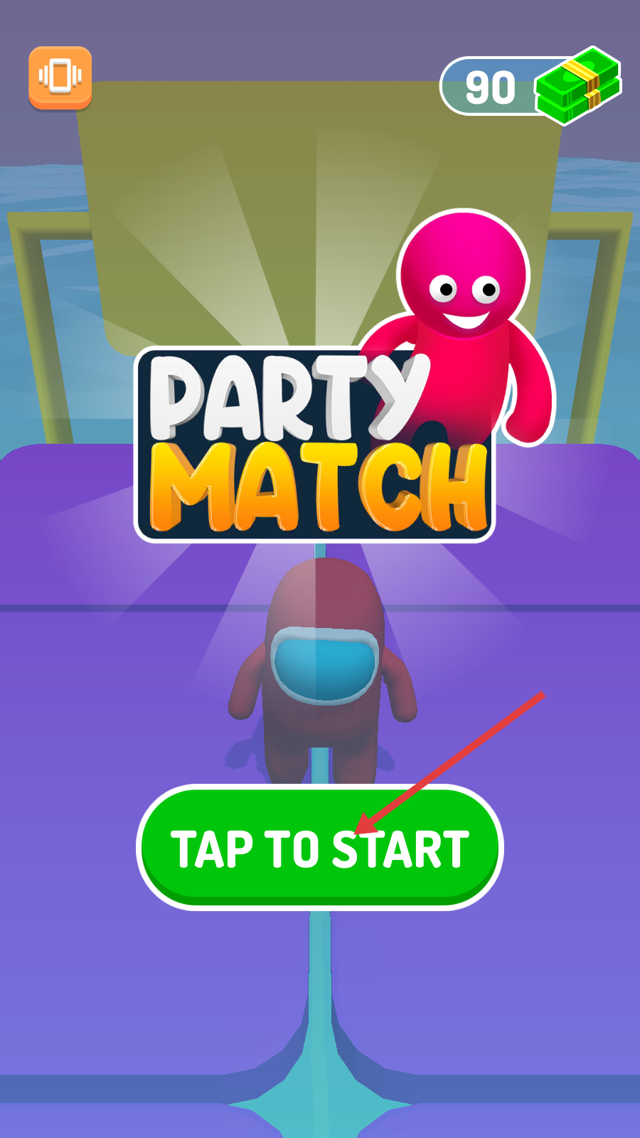 1、点击【TAP-TO-START】绿色按钮,进入【PARTY-MATCH】游戏,初始持有【90】货币开启匹配挑战。