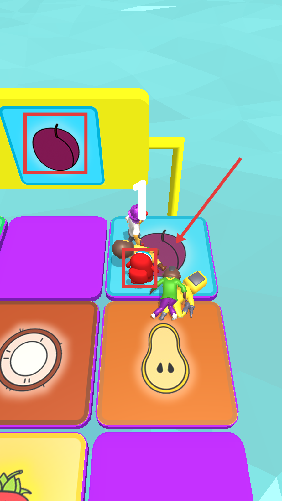 3、依据上方【李子】图案提示,移动红色角色至对应水果方块,与其他角色竞争完成匹配任务。