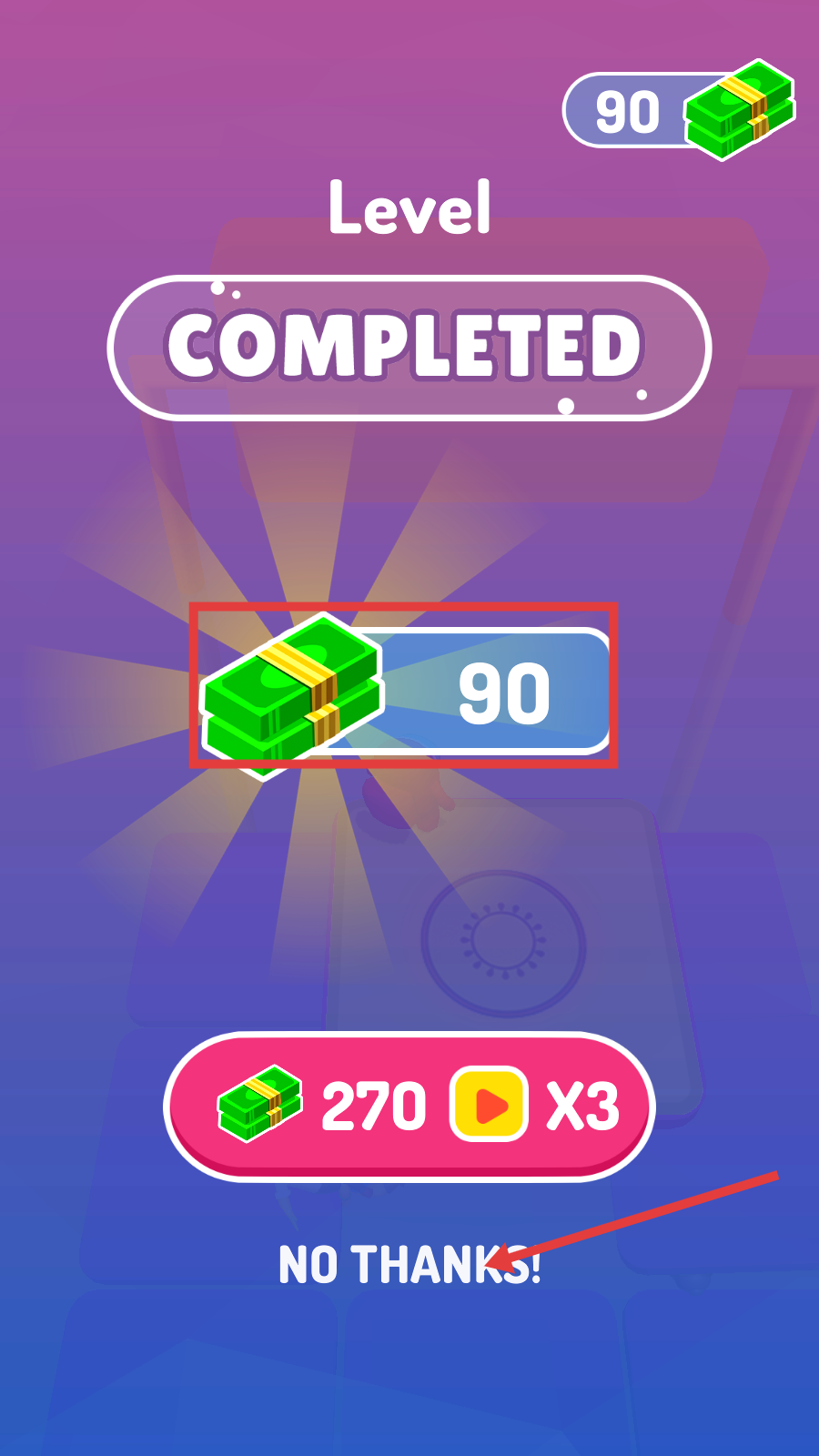 4、关卡完成获得【90】货币奖励,界面有【NO-THANKS!】按钮,可选择是否放弃额外奖励。