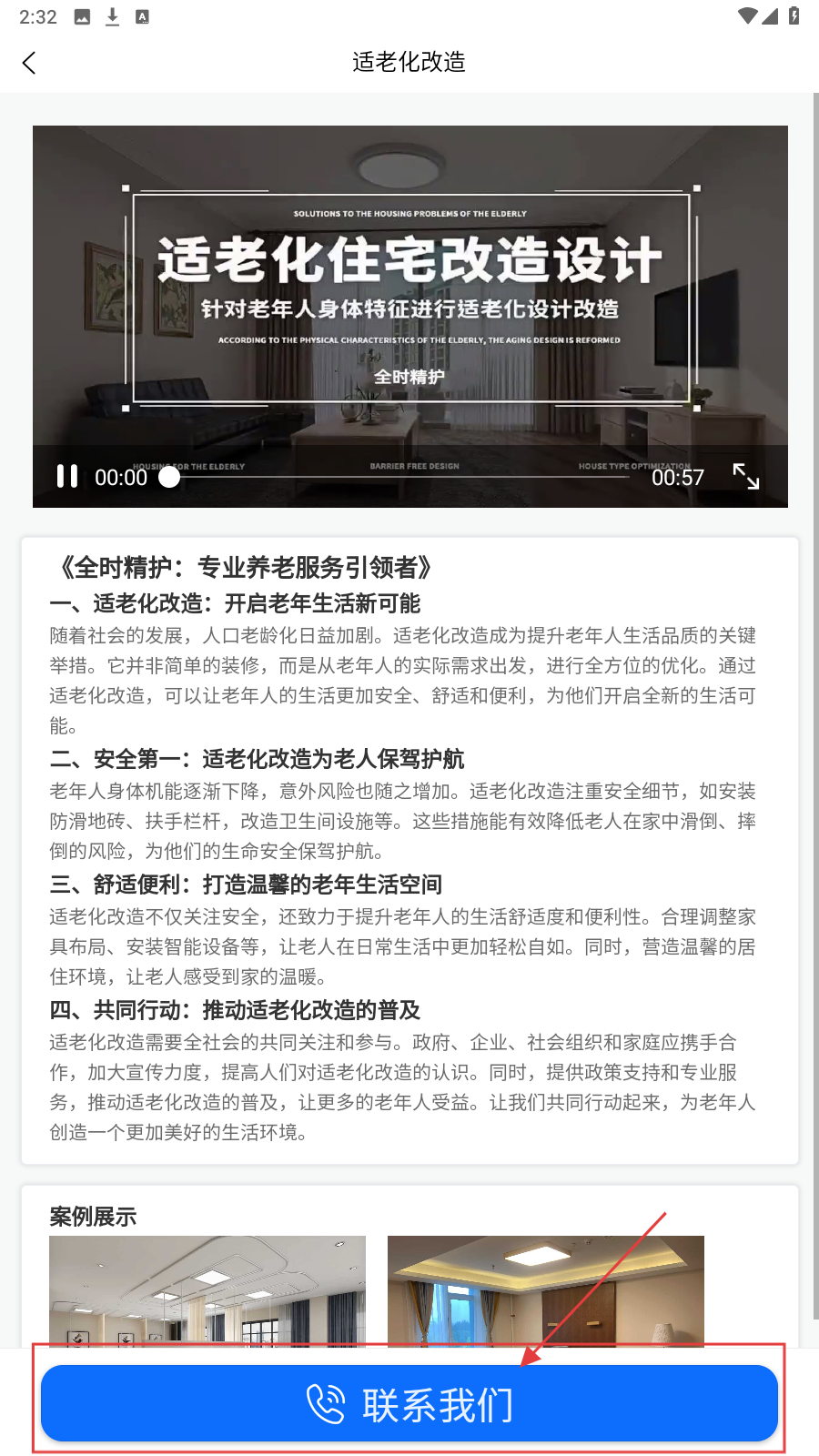 2、进入【适老化改造】页面,若需服务,点击底部【联系我们】咨询。