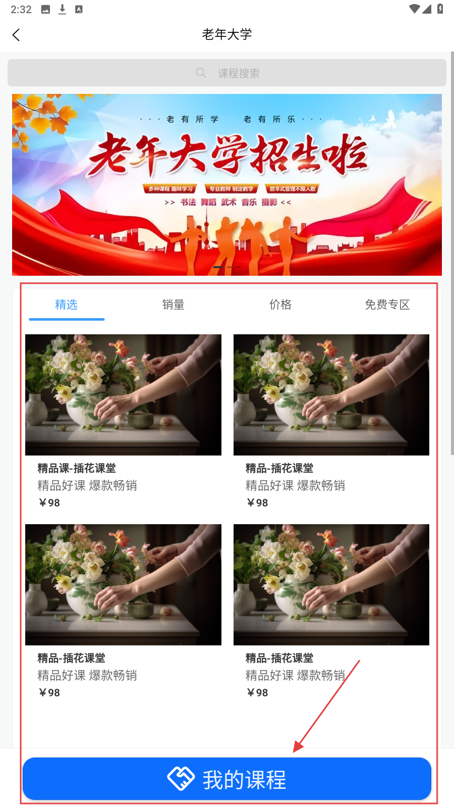3、在【老年大学】页,选感兴趣课程,点底部【我的课程】查看已购课程。
