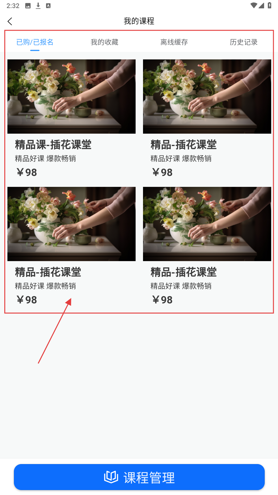 4、进入【我的课程】,点击已购【插花课堂】课程,即可开始学习内容。