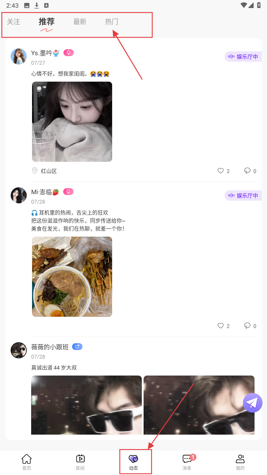 4、切换到【动态】页,点击顶部【热门】标签,浏览热门动态内容。