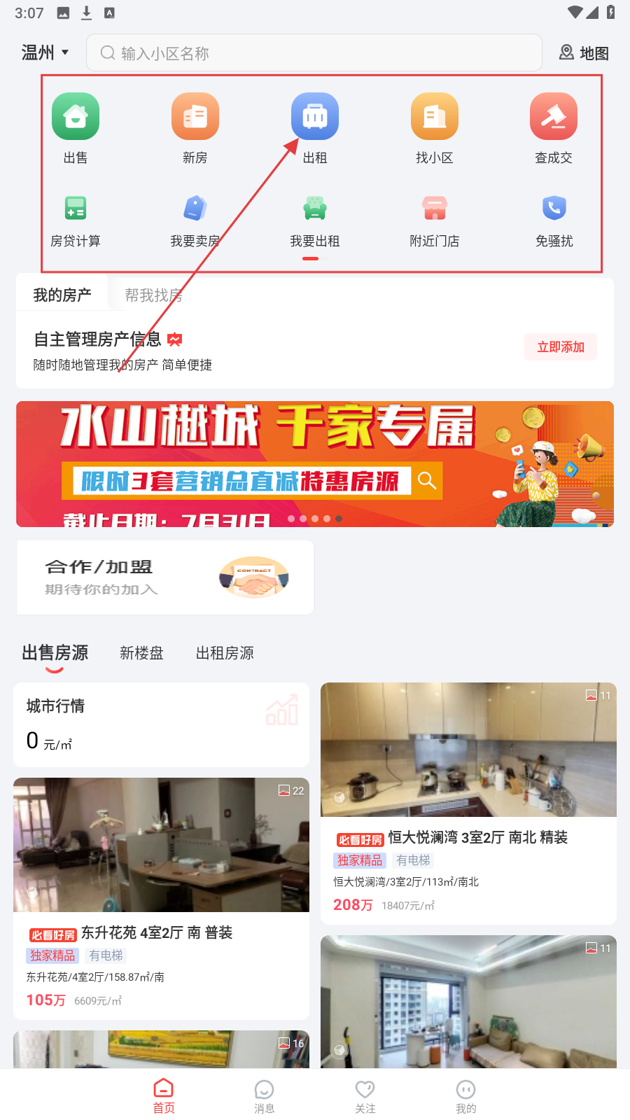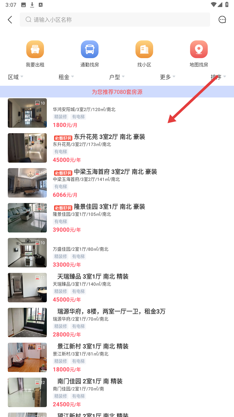 1、在首页点【出租】,进入出租房源列表页选心仪房屋。