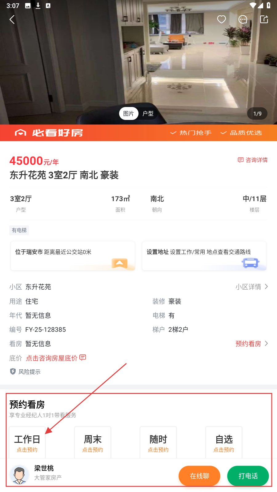 3、在房屋详情页,选【工作日】预约看房,联系经纪人梁世桃。