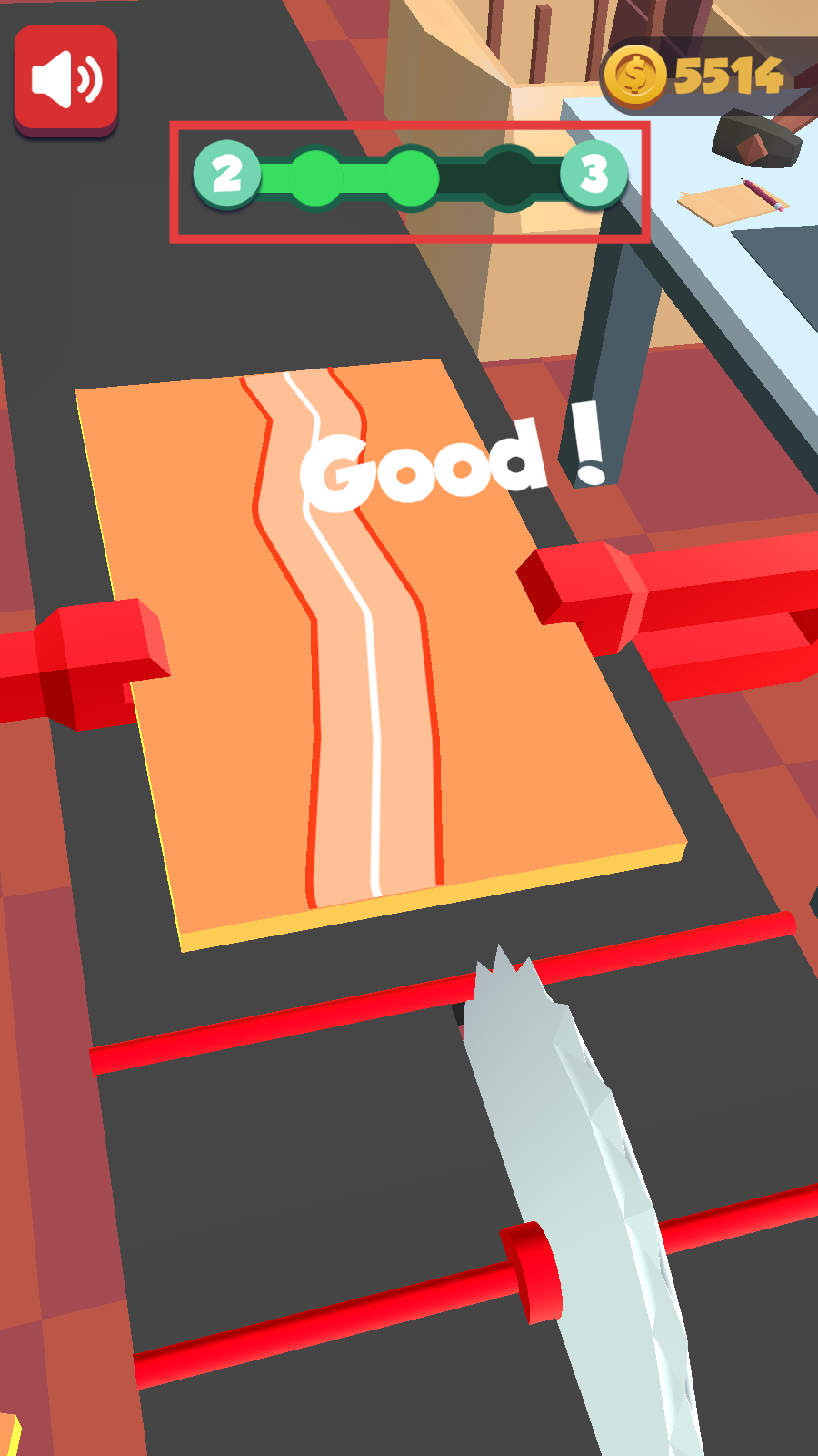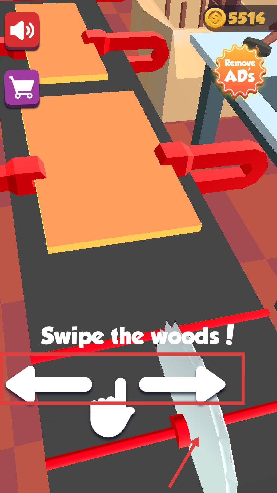 1、依据【Swipe-the-woods!】提示,左右滑动屏幕操控锯子,消耗金币-5514开启木板切割挑战。