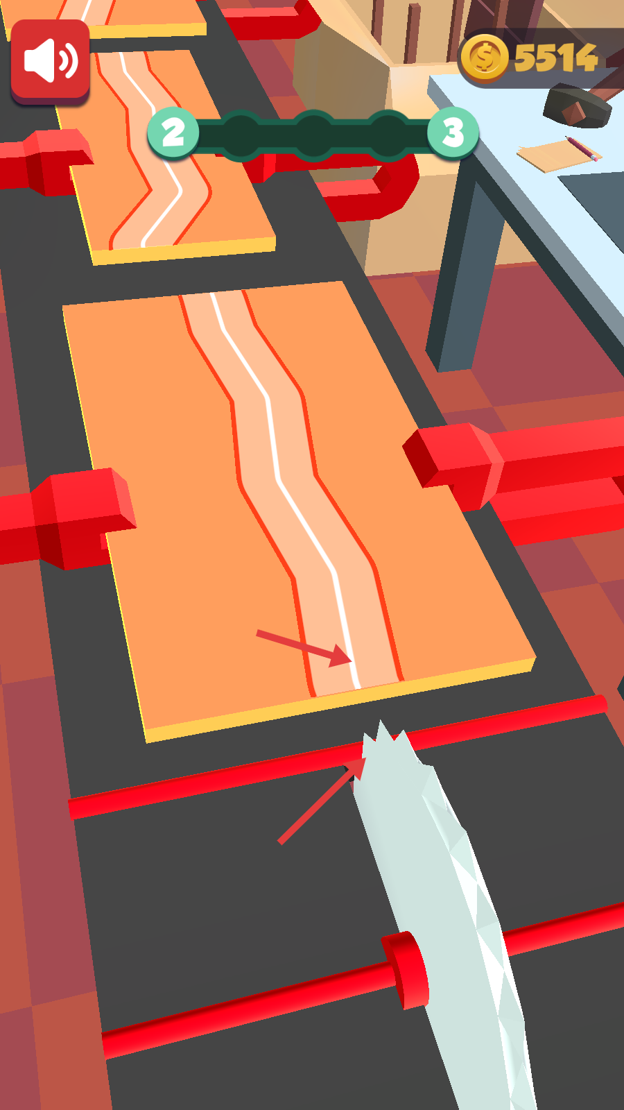 2、沿木板上白色路径滑动锯子切割,上方进度条从【2】向【3】推进,需精准操作保障切割连贯。