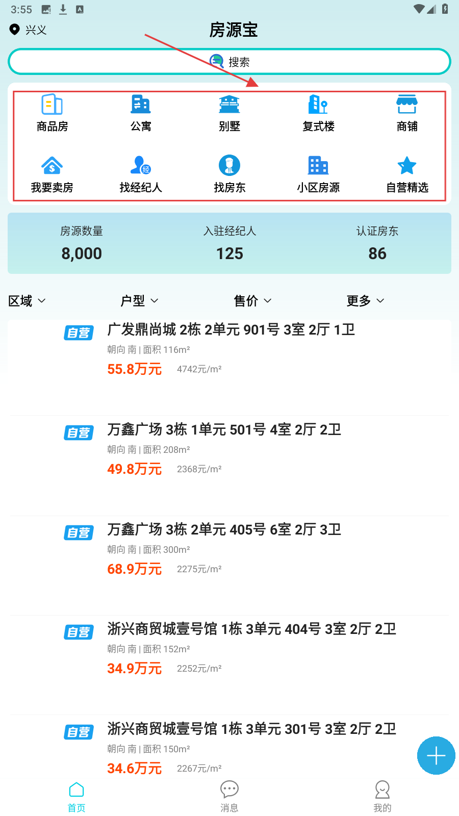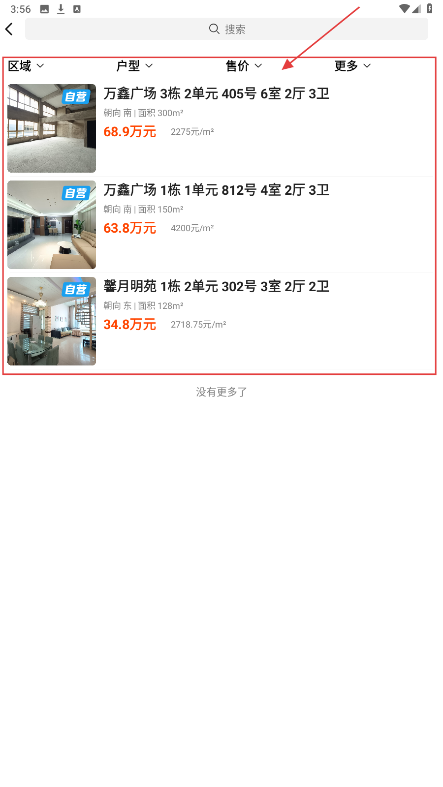 2、在房源列表,按【售价】排序,找符合预算的房源。