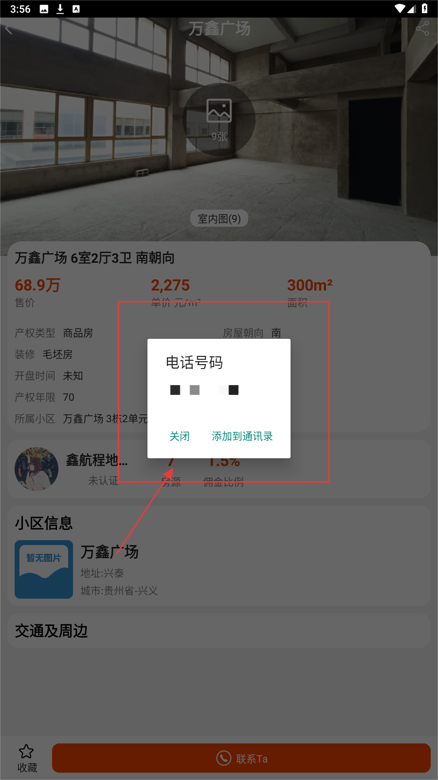 4、查看经纪人电话,可【添加到通讯录】,联系沟通房源。