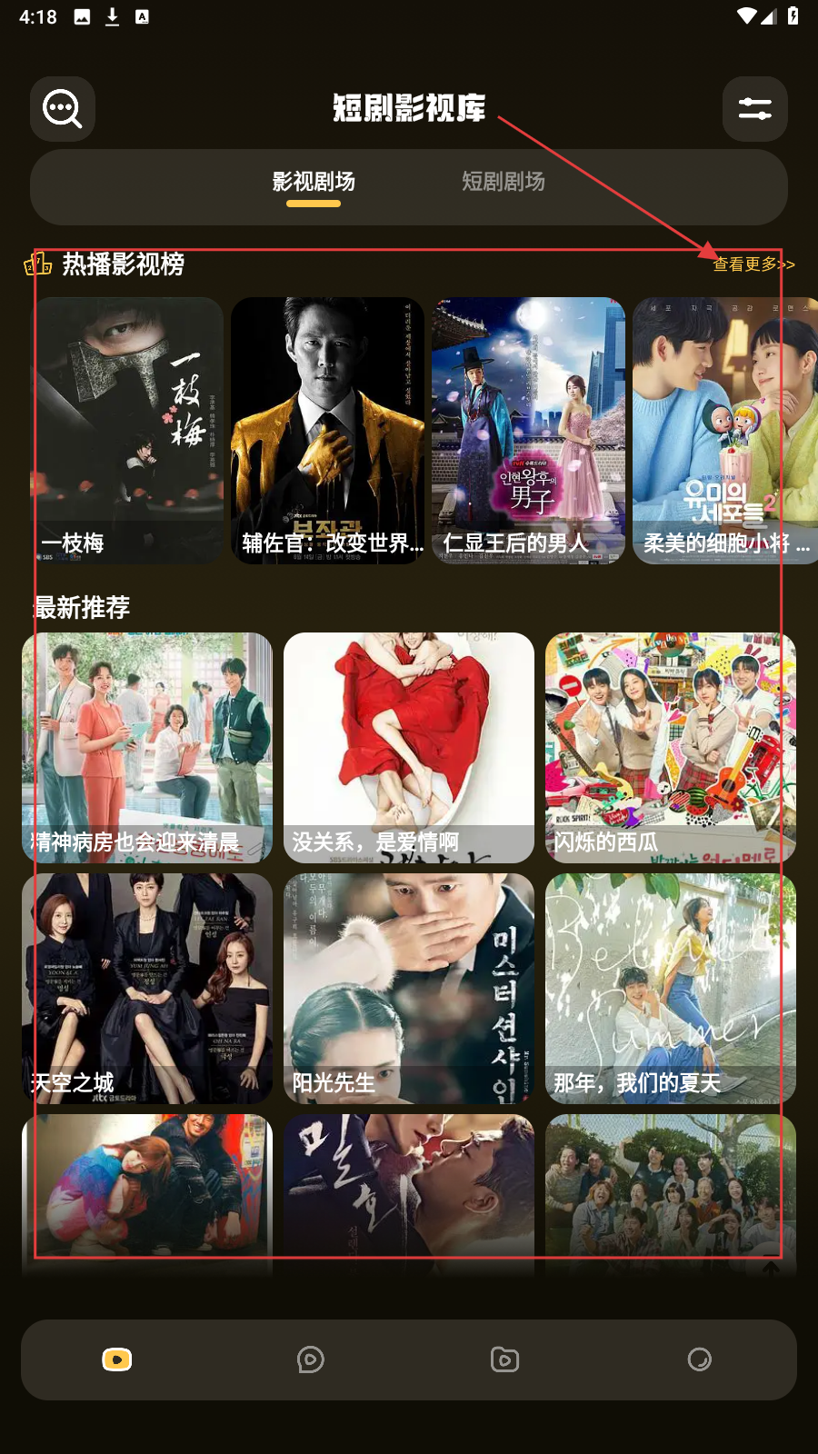 1、在【短剧影视库-影视剧场】,点【热播影视榜-查看更多】,浏览榜单找剧。