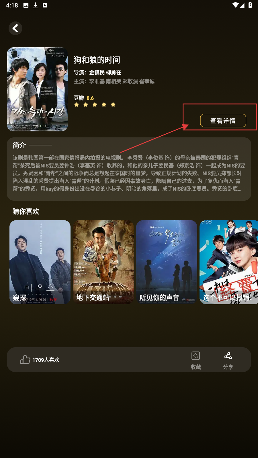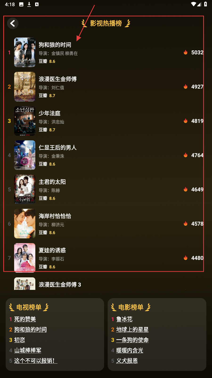 2、进入【影视热播榜】,选高分剧(如【狗和狼的时间】),查看基础信息。