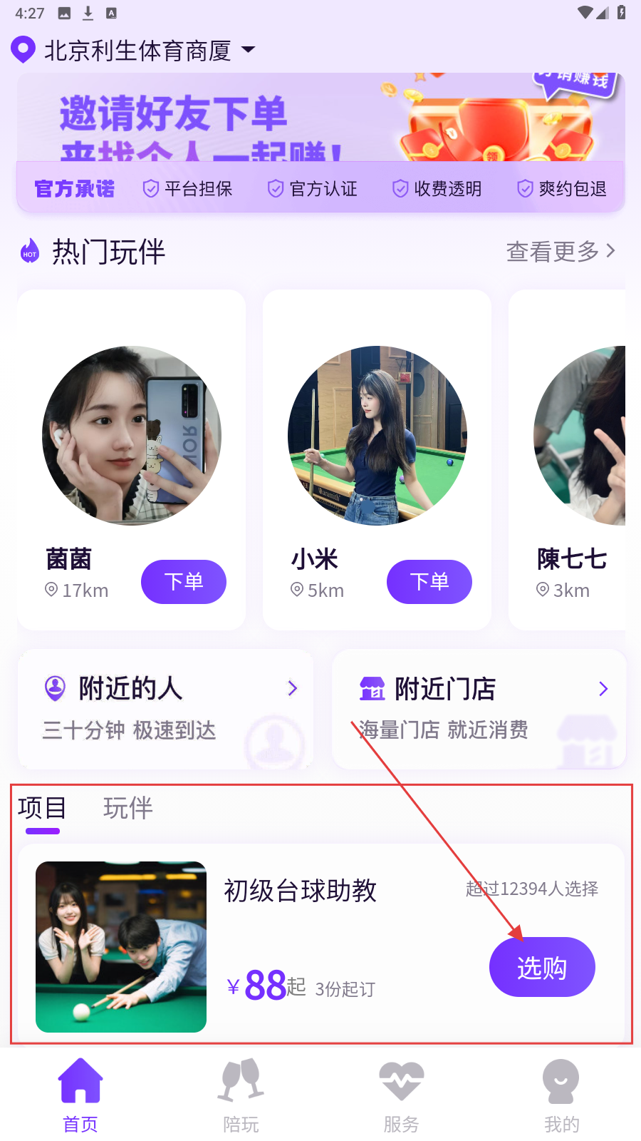 1、在首页选【初级台球助教】项目,点击【选购】进入玩伴选择页。