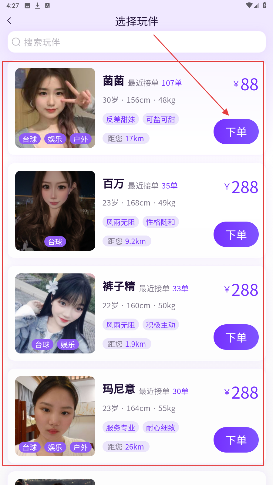 2、浏览玩伴列表,选心仪玩伴(如菌菌),点击【下单】到订单页。