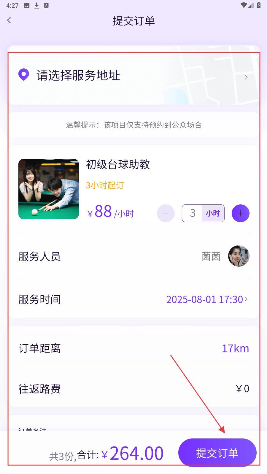 3、填服务地址,确认时长、人员、时间,点【提交订单】进支付页。