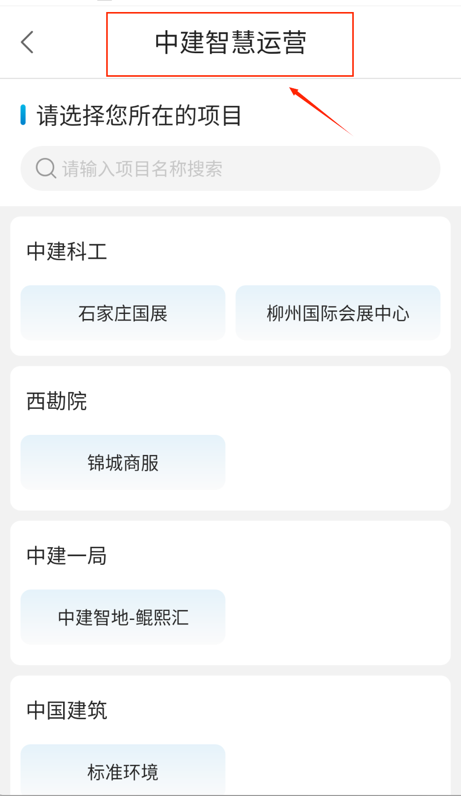 3、登录成功进入项目选择页,顶部搜索框可输入名称查找,下方展示中建科工等合作项目,点击即可进入呀。重要项目建议收藏哦。