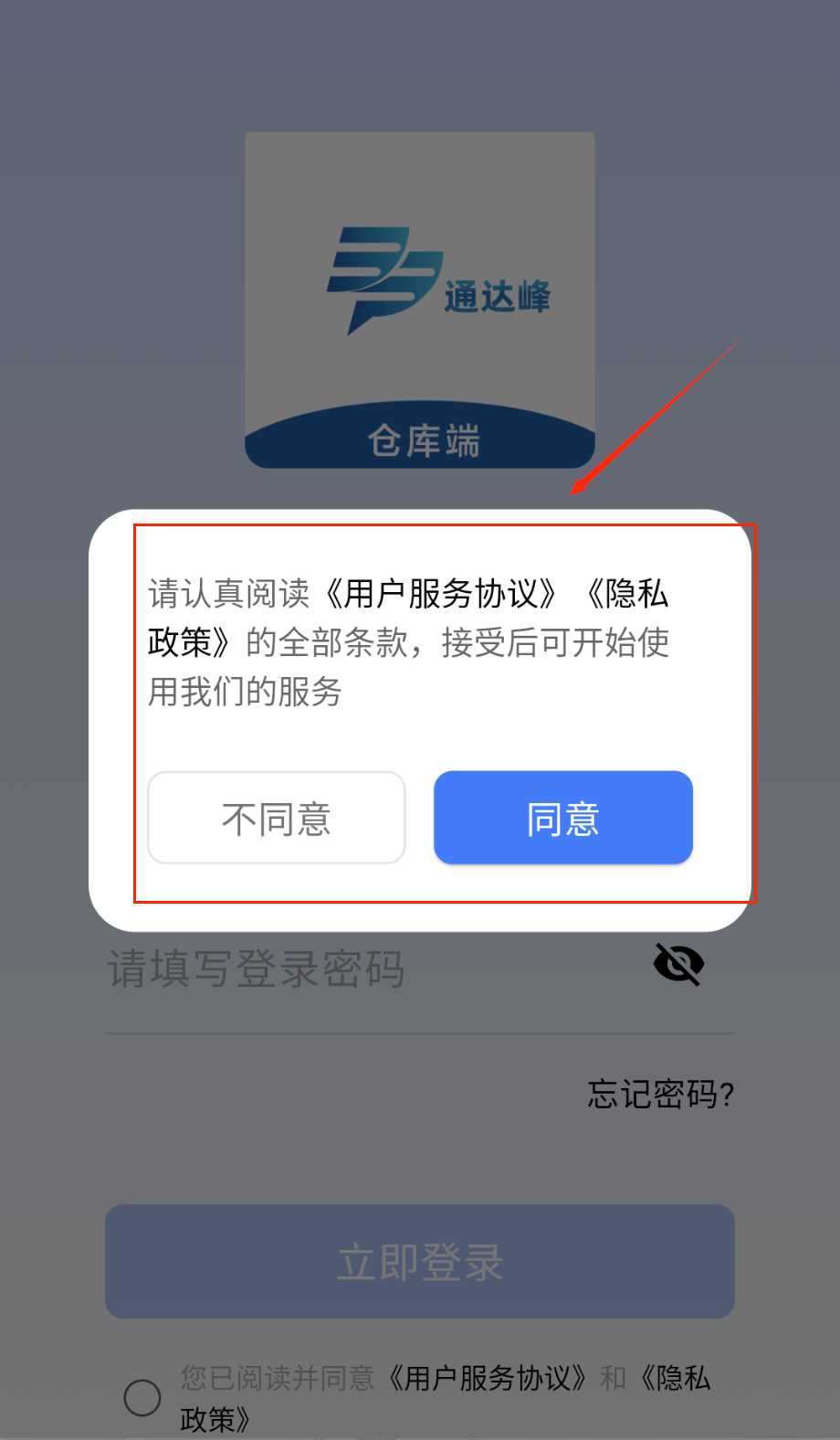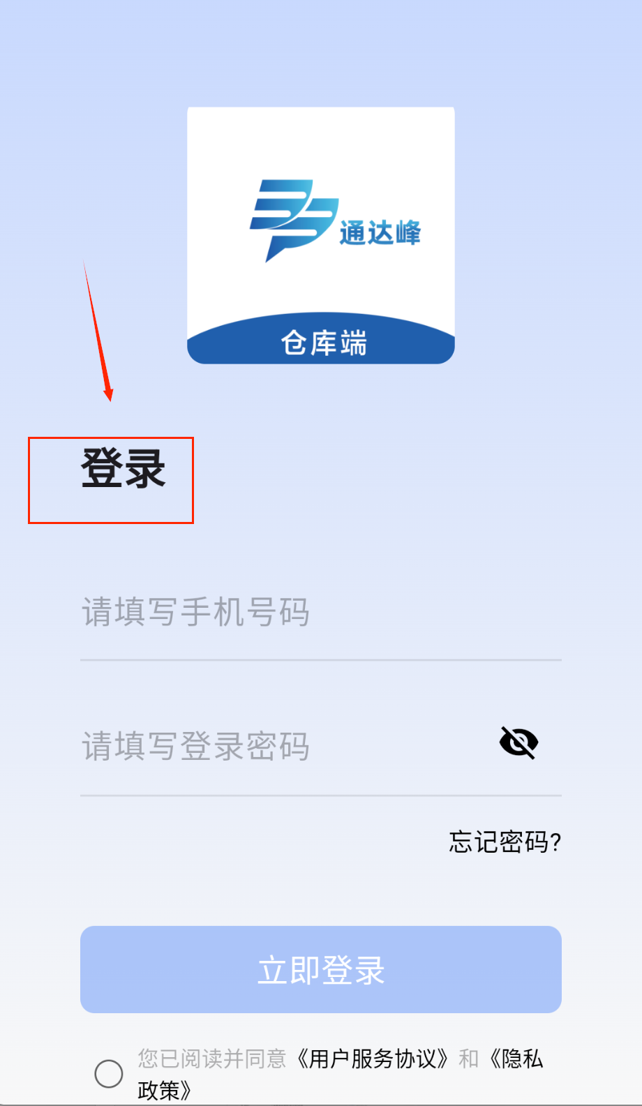 1、打开APP进入登录页,顶部显示"通达峰仓库端"蓝色logo,下方是手机号和密码输入框呀。密码框右侧眼睛图标可切换显示哦。