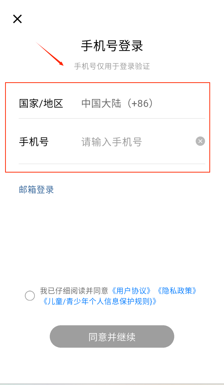 2、手机号登录页默认中国大陆+86区号,输入框提示"请输入手机号",上方注明号码仅用于验证呀。邮箱登录选项在页面底部啦。