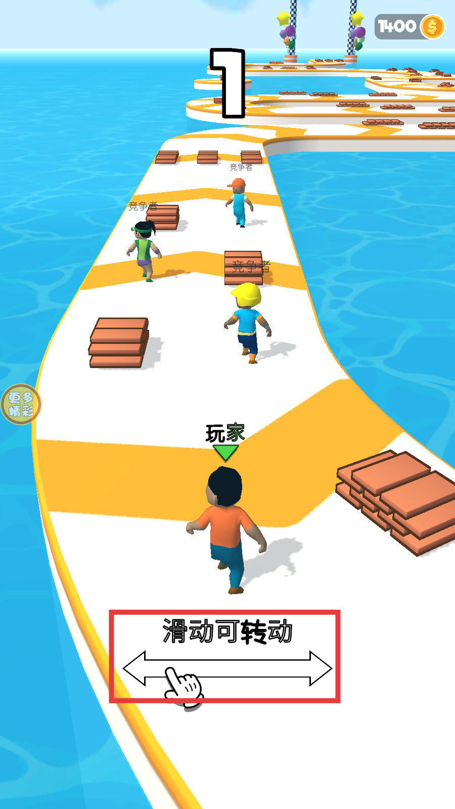 2、依据【滑动可转动】提示调整视角,灵活避开竞争者,快速收集沿途木材,争取率先抵达前方区域。