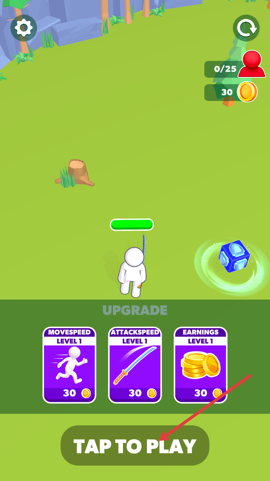 1、点击【TAP-TO-PLAY】进入关卡,优先用初始【30-金币】升级【MOVESPEED-LEVEL-1】,提升移速助力前期战斗。