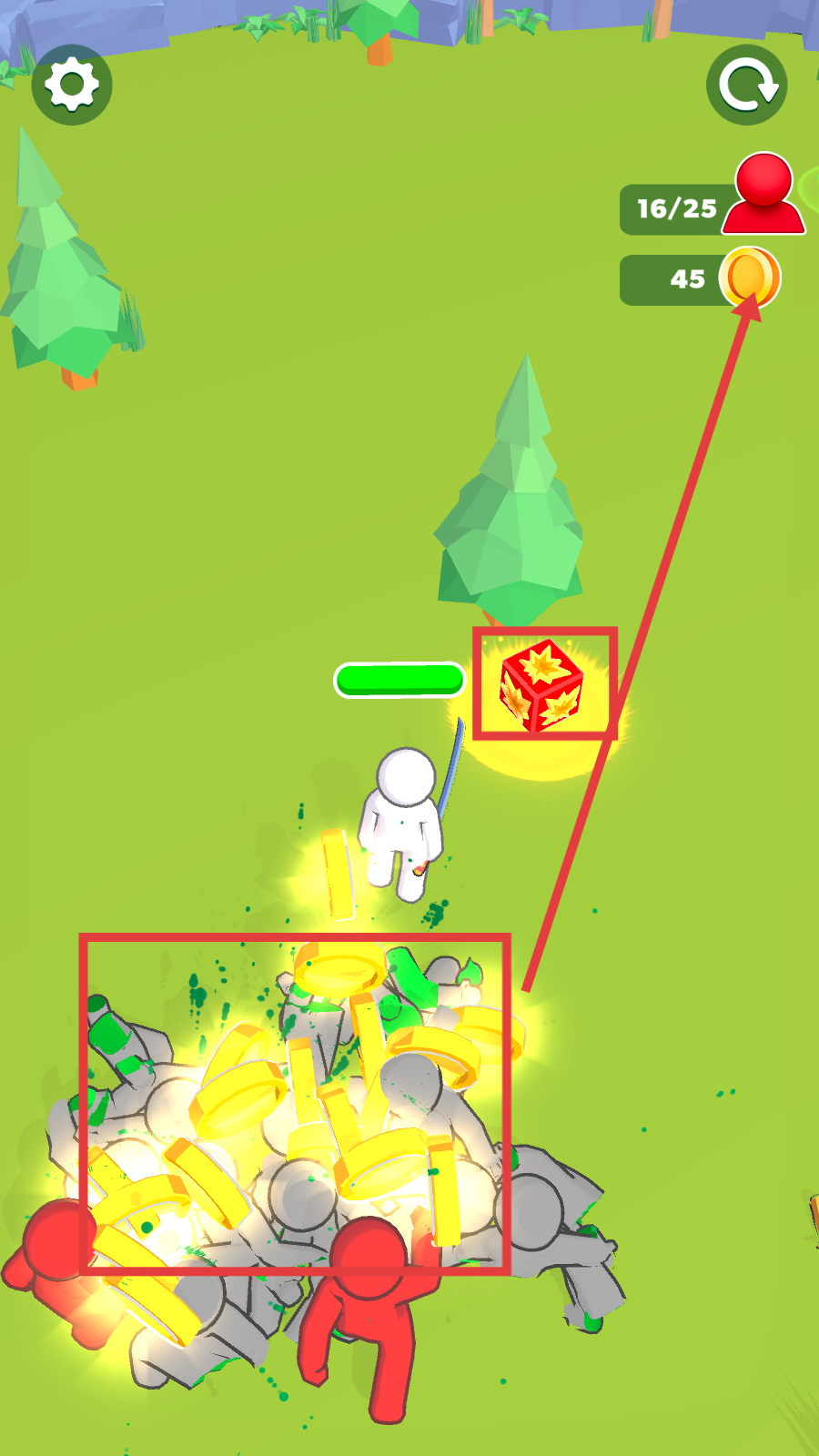 3、击败敌人后收集金币与【红色宝箱】,积累至【45-金币】,推进【16/25-敌人】任务进度,提升资源储备。