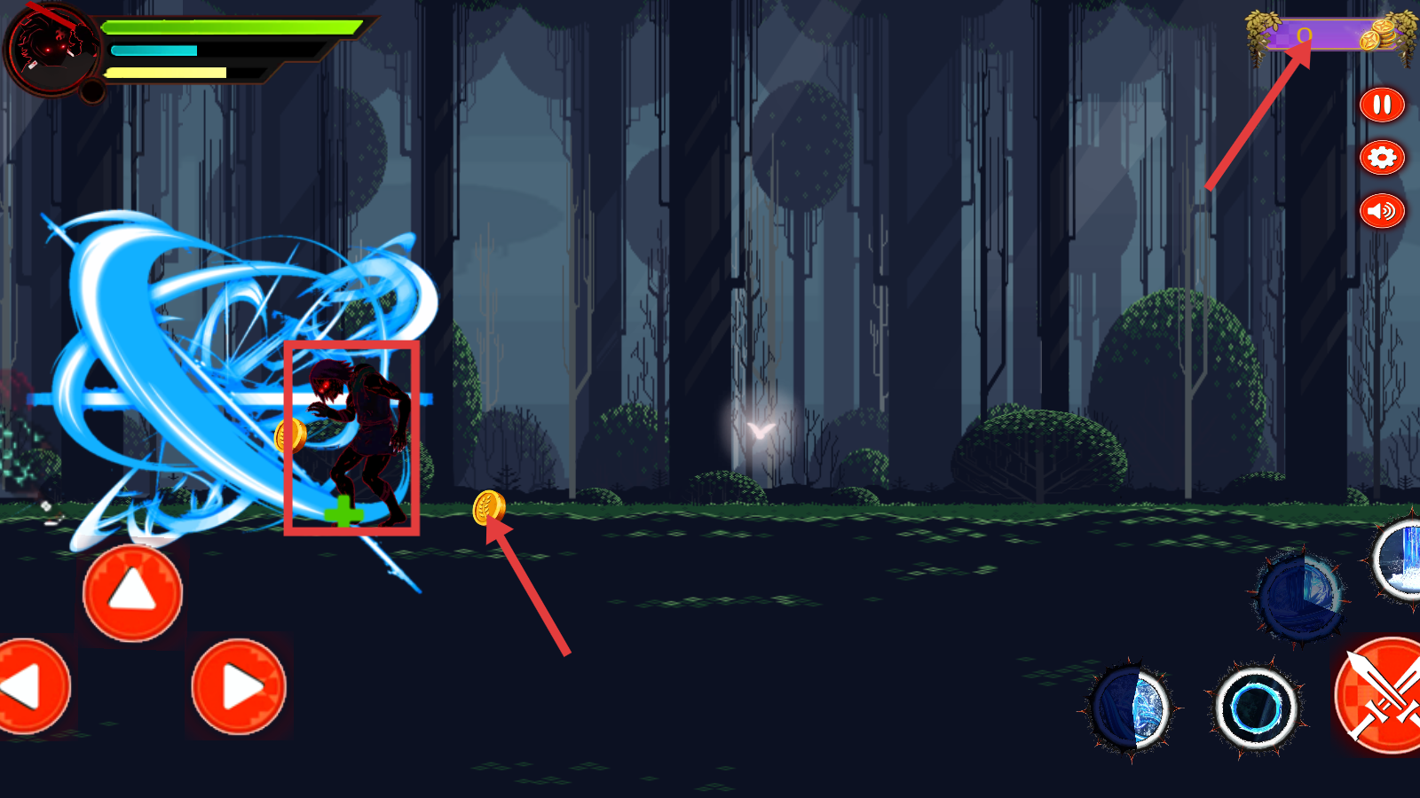 3、战斗时释放【蓝色-技能】击败敌人,收集掉落的【金币】,积累右上角资源,提升角色战力。