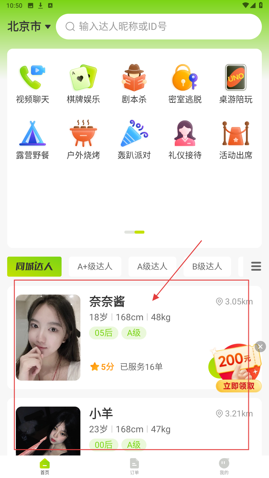 1、打开应用,在【首页】选择同城达人并点击。