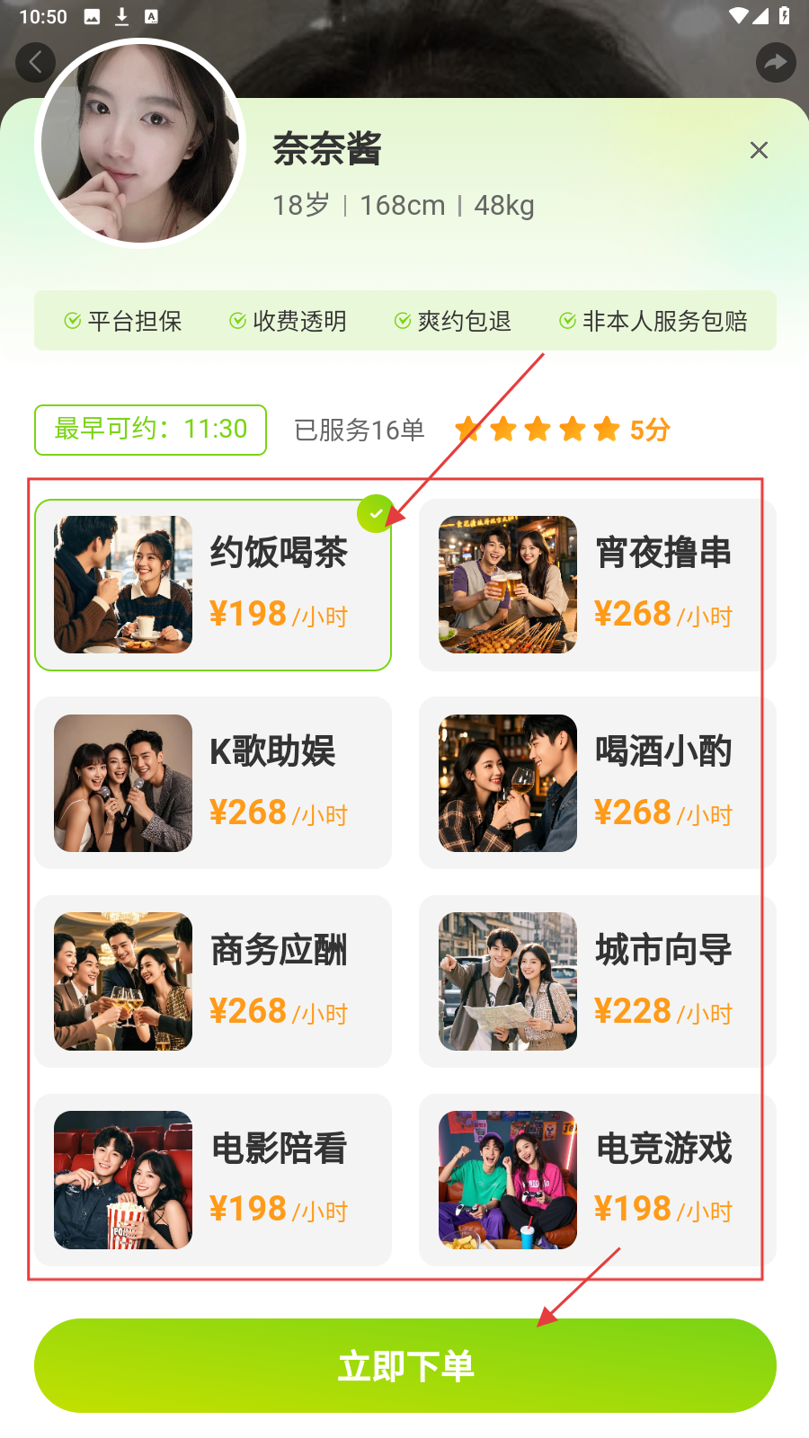 3、选择需要的服务类型,如【约饭喝茶】,选择好后点击【立即下单】。