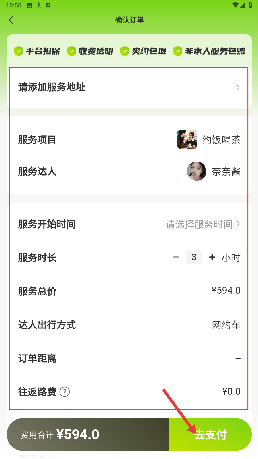 4、在【确认订单】页面,添加服务地址,确认下单信息无误后,点击【去支付】即可。