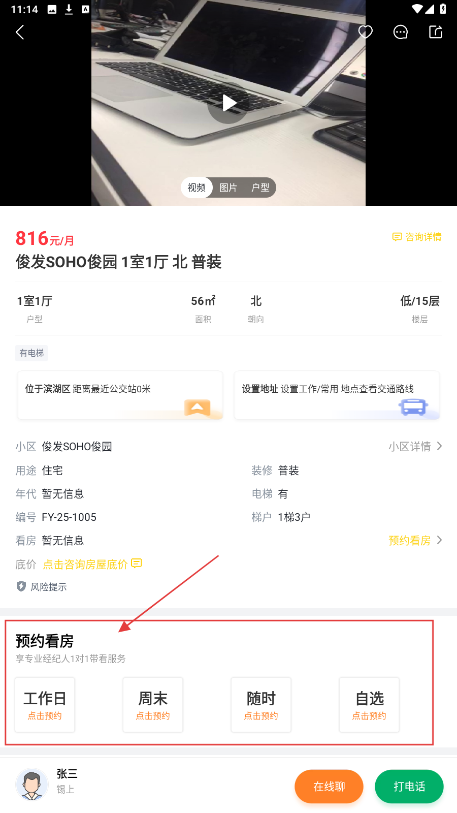 3、进房源详情页,点【预约看房】模块选时间(工作日等)。
