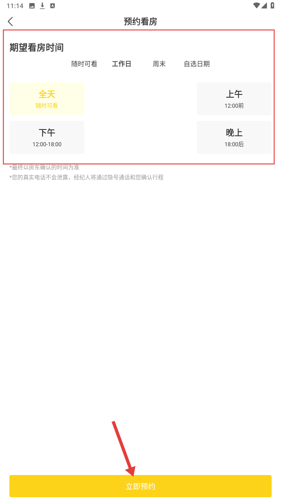 4、选定期望看房时段,点【立即预约】完成租房看房预约。