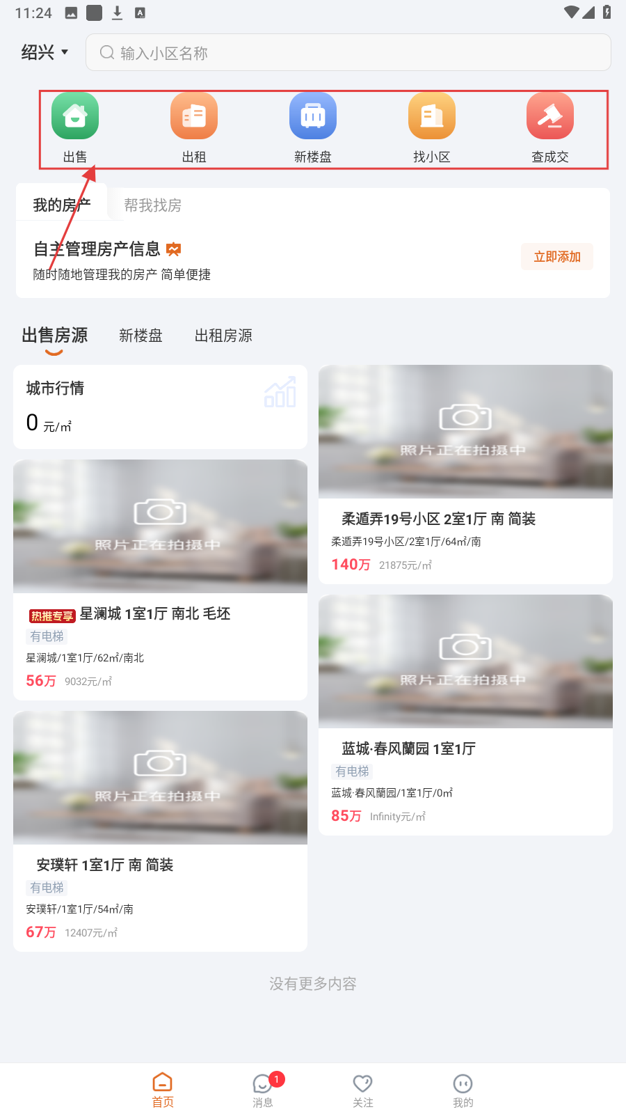1、首页点【出售】,进入售房列表,筛选绍兴区域心仪房源。