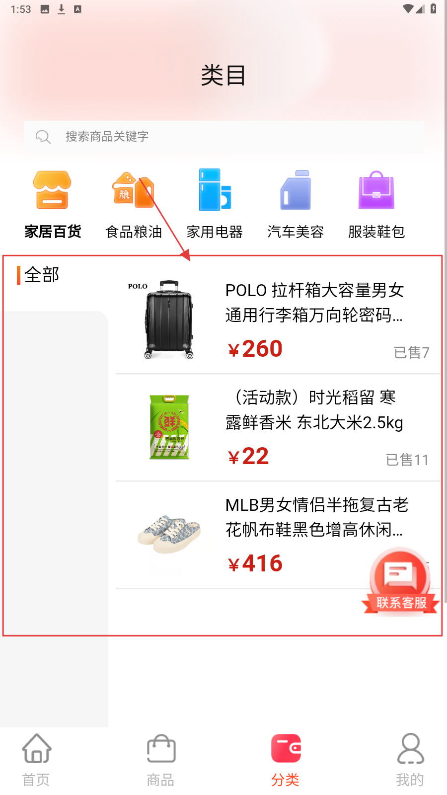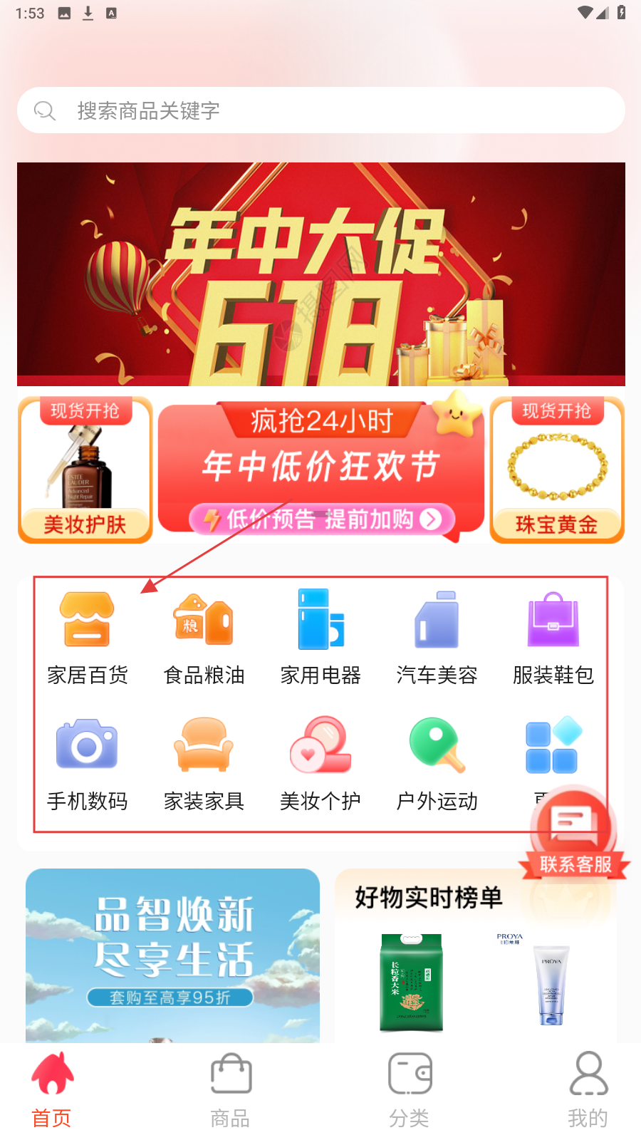 1、首页选分类(如家居百货),进入类目页找目标商品。