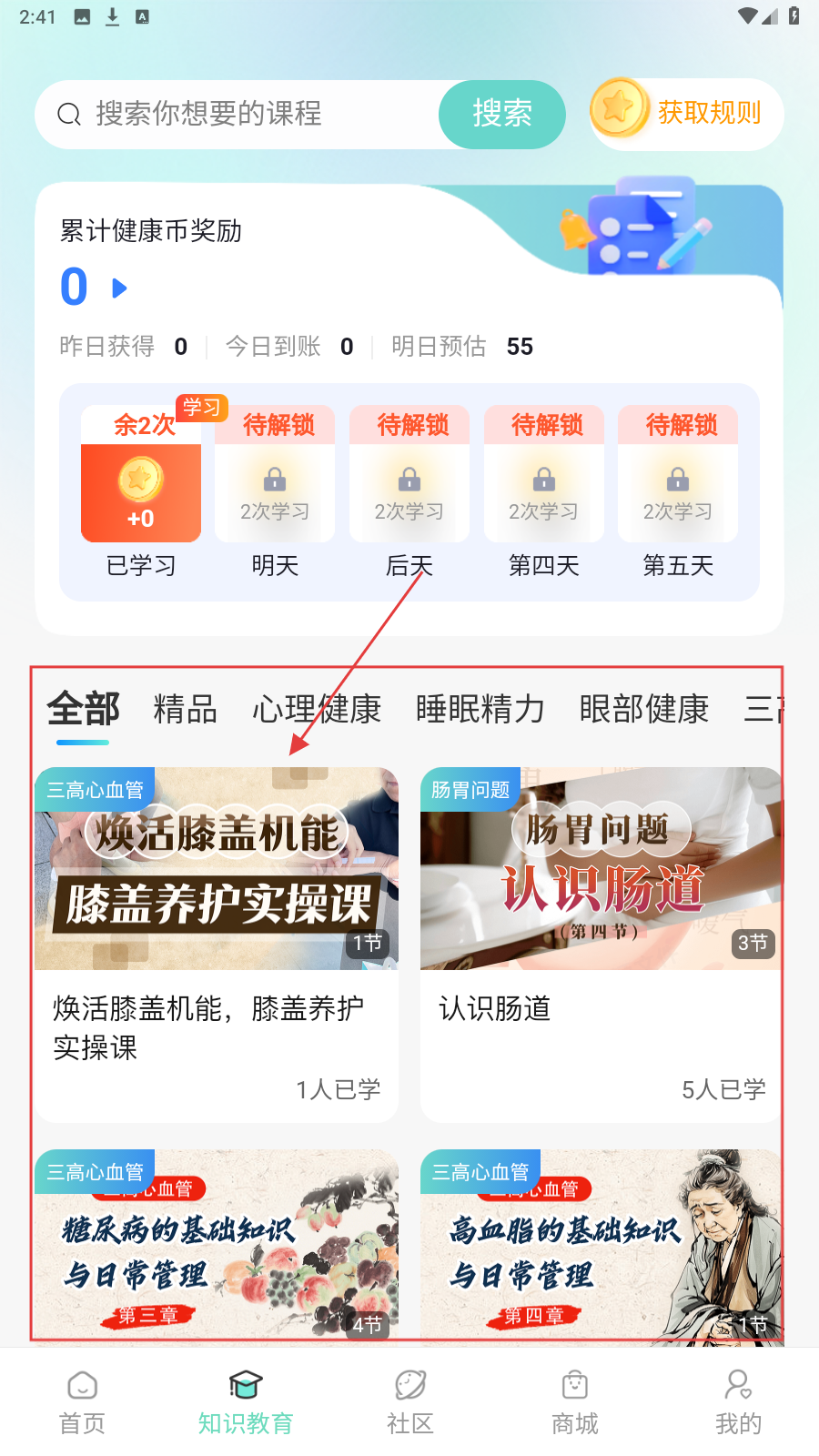 1、进入【知识教育】页,选感兴趣分类,如【三高心血管】,点对应课程进入详情。