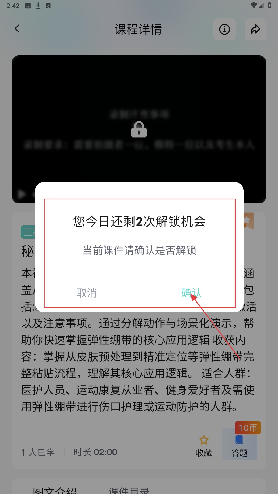 3、若课程锁定,当有解锁机会时,点确认解锁,消耗次数开启课程。