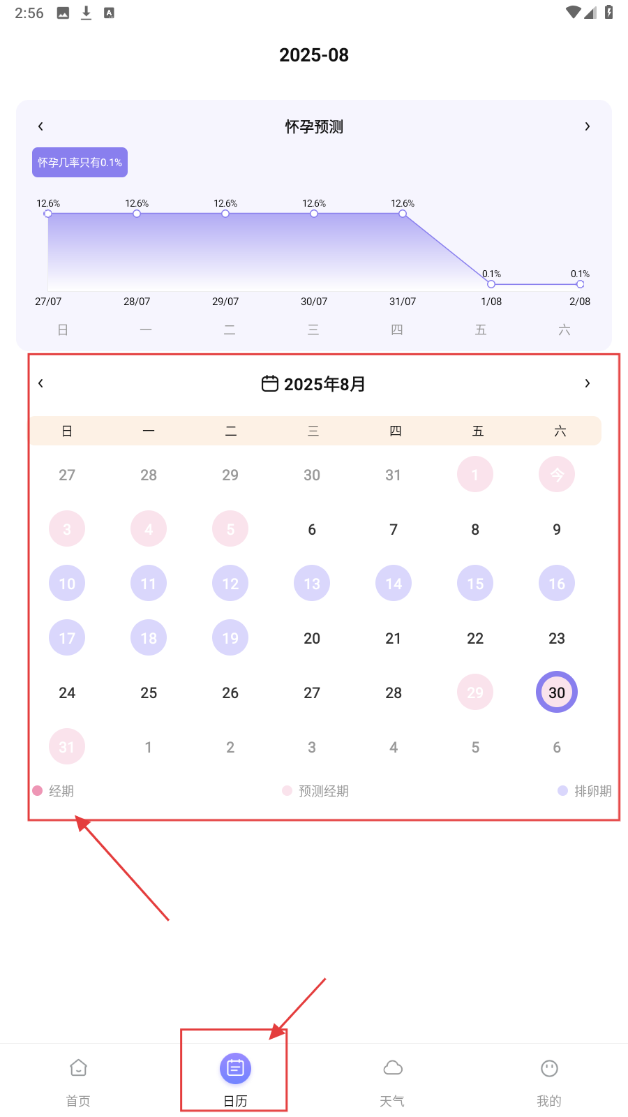 3、点底部【日历】,查看日历,了解经期、预测经期、排卵期分布。