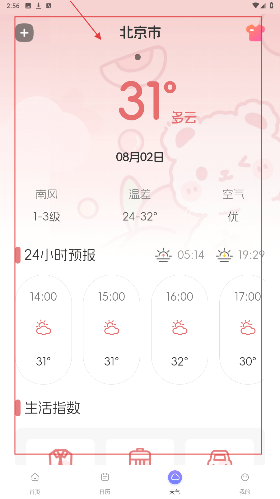 4、切换到【天气】页,查看北京市天气,了解温度、风力、生活指数等信息。