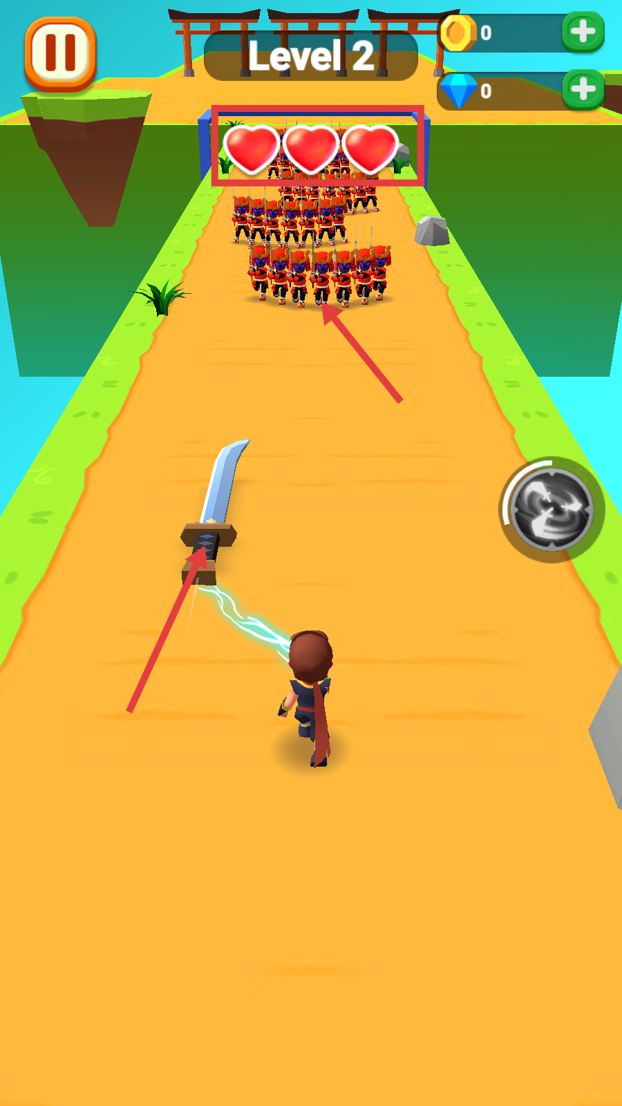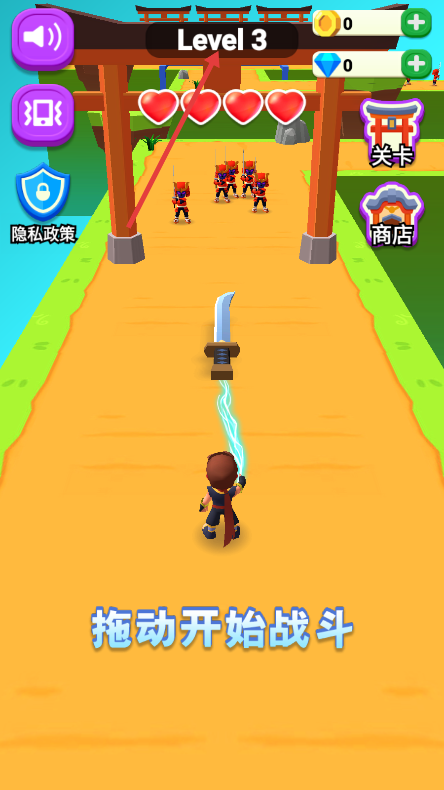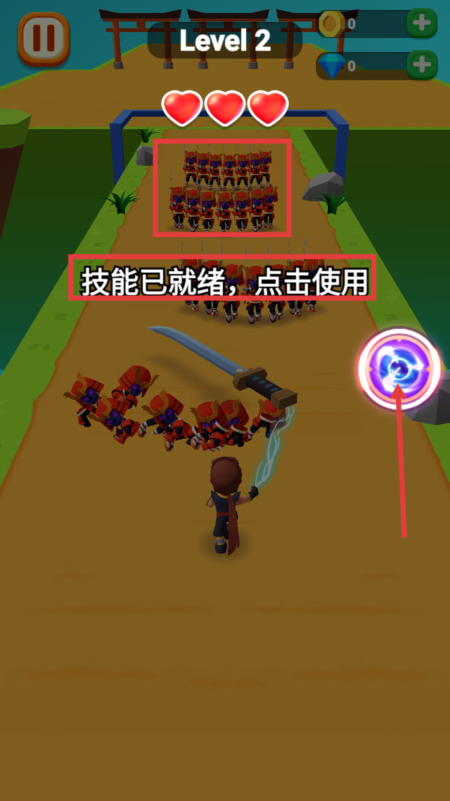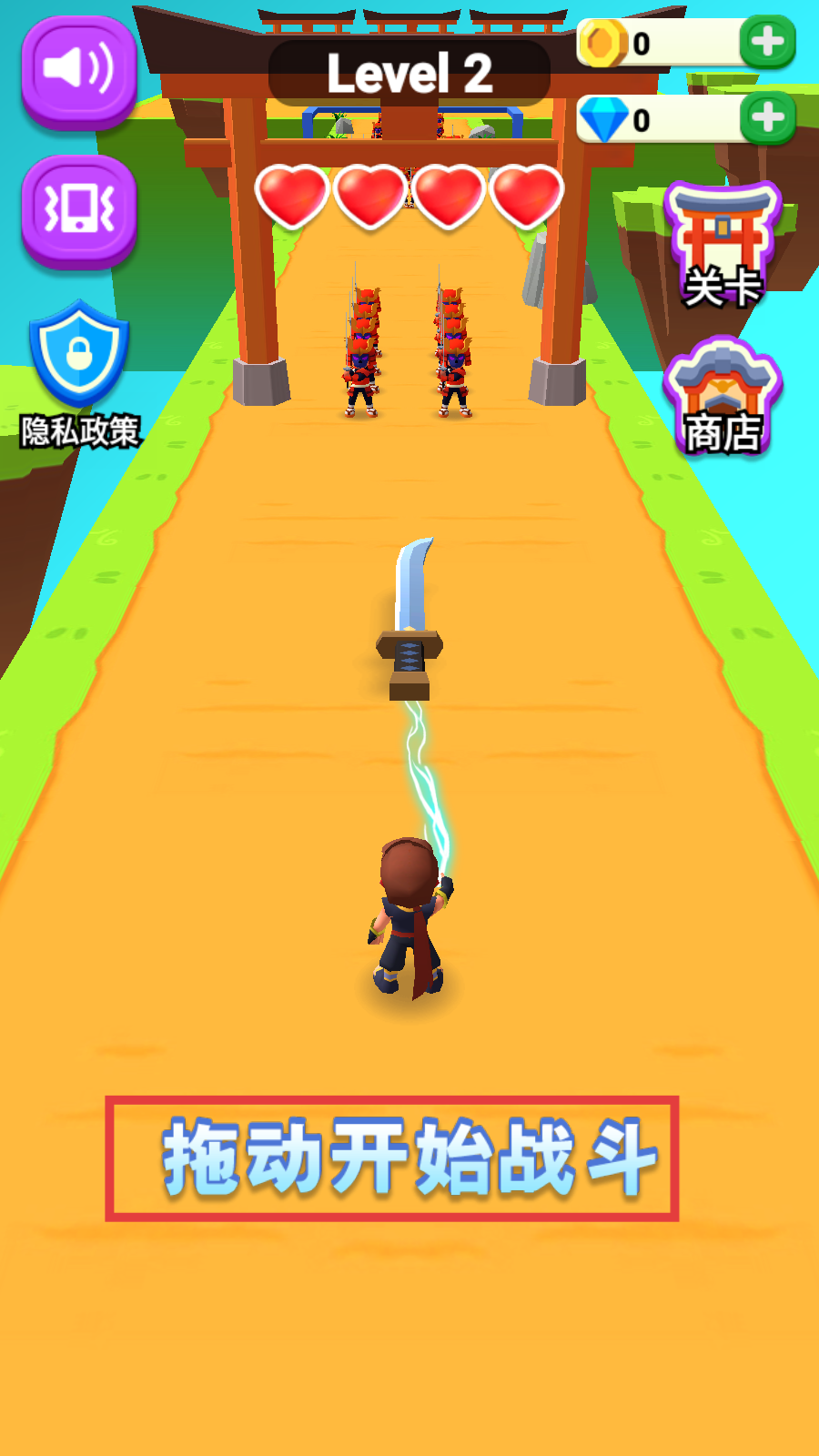 1、进入【Level-2】,拖动角色开始战斗,初始有【4-颗爱心】血量,面对前方敌人,准备迎击。
