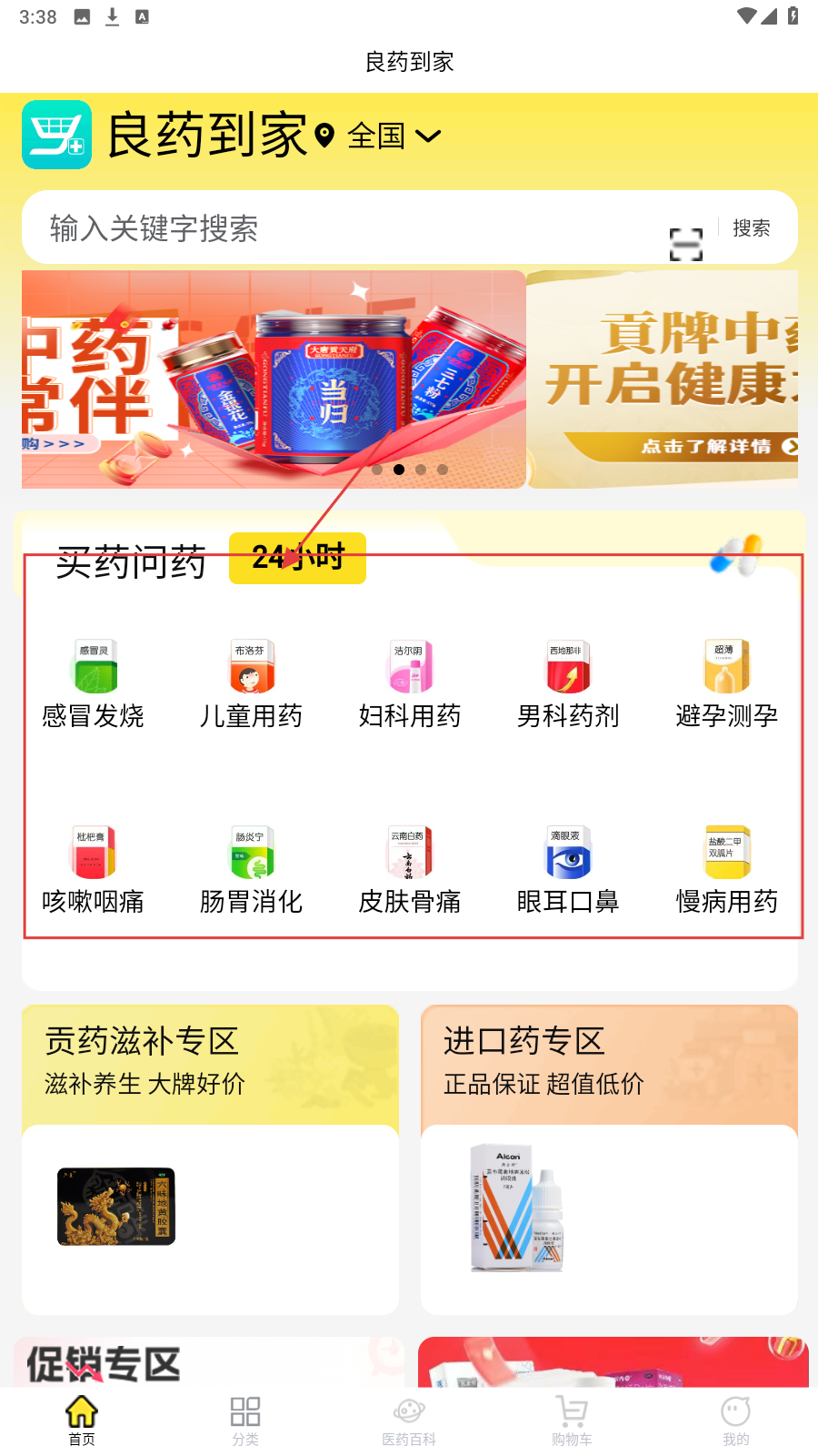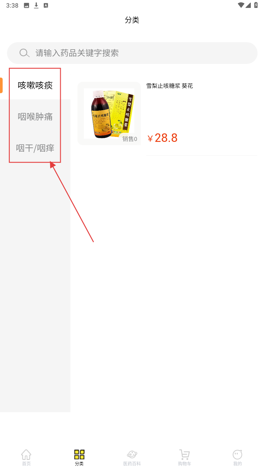 1、打开【良药到家】首页,选对应分类,如【咳嗽咽痛】,进入分类页。