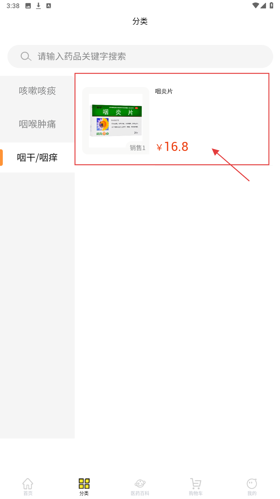2、在分类页,选具体症状分类,如【咽干/咽痒】,筛选对应药品。