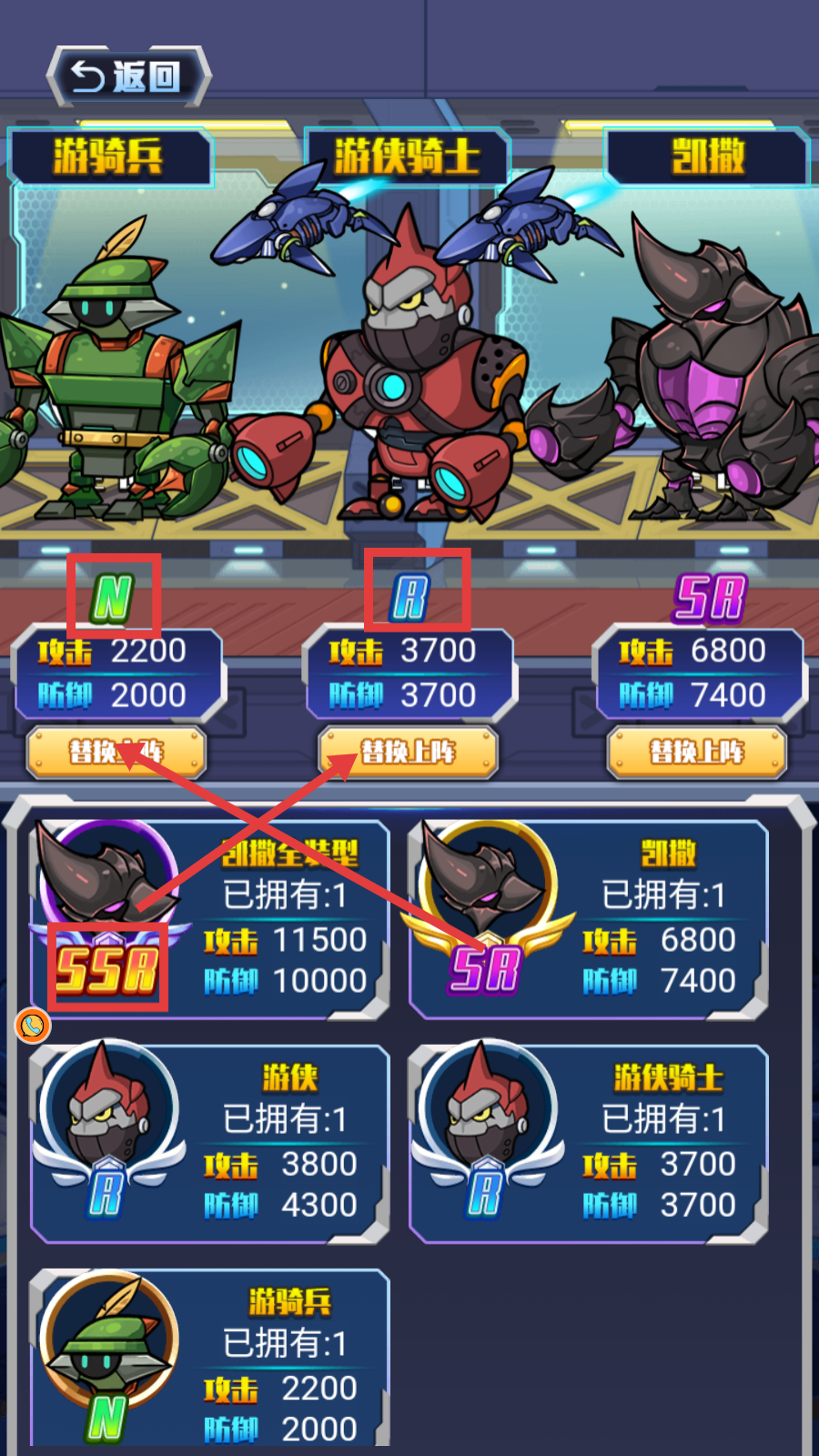 1、在角色替换界面,优先将【N-游骑兵】替换为【SSR-凯撒全装型】,利用高【攻击-11500】【防御-10000】提升队伍战力。