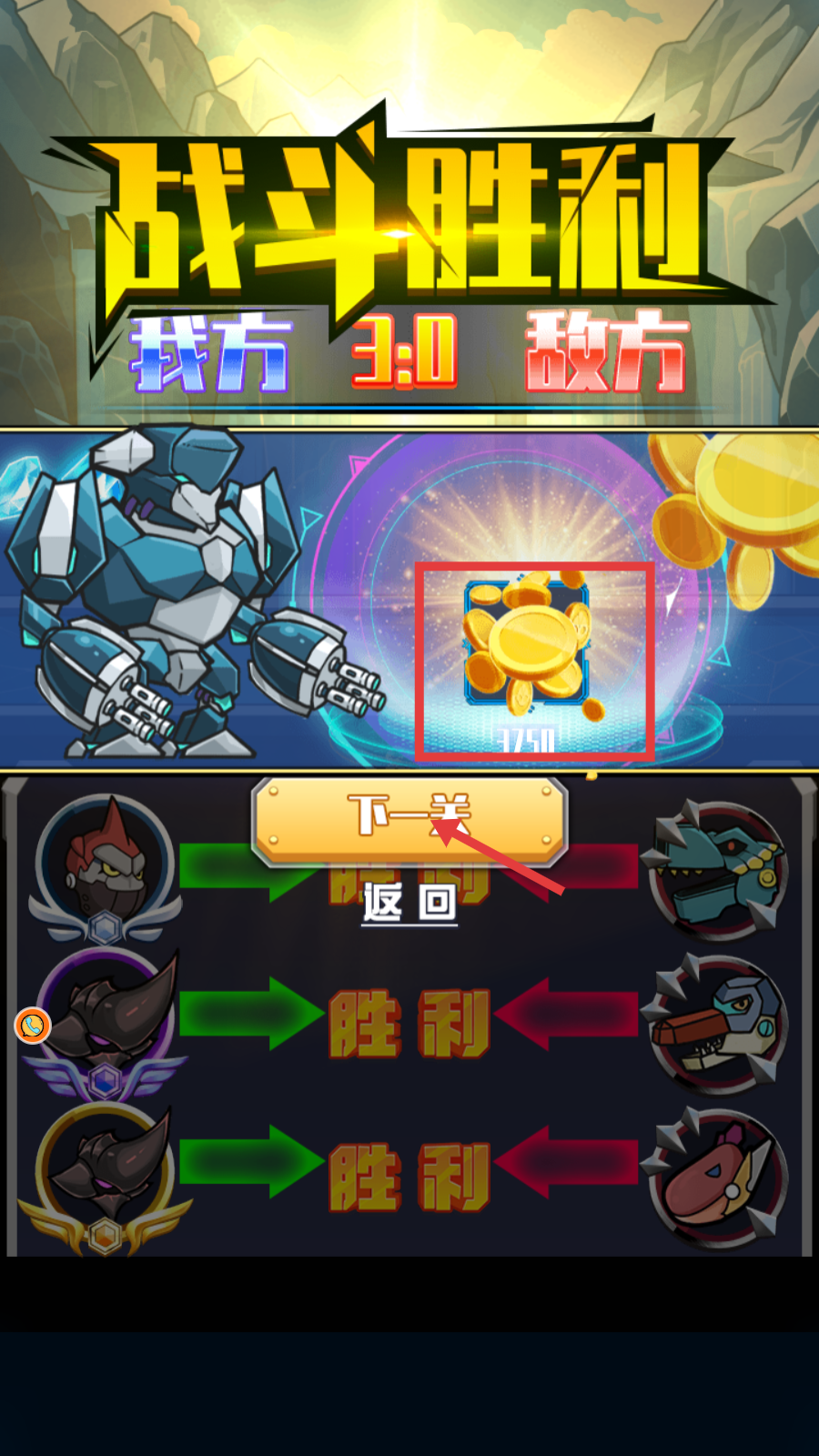 4、战斗胜利后获取【750-金币】奖励,点击【下一关】按钮继续挑战,积累资源用于角色养成与战力提升。