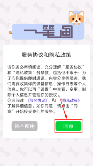 1、同意协议:在“服务协议和隐私政策”界面点击“同意”,正式进入游戏。