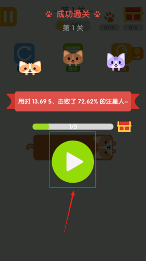 3、查看结果:出现“成功通关”提示后,查看用时与击败百分比,再点击下一关按钮继续。