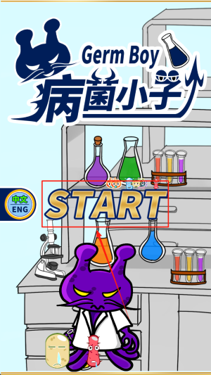 1、启动游戏:在“Germ Boy 病菌小学”主界面点击“中文”后,再点“START”进入游戏。