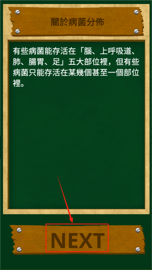 2、阅读介绍:在“关于病菌分布”页面浏览文字后,点击“NEXT”继续。