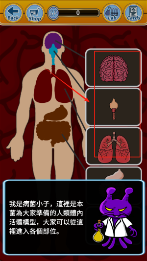 3、了解功能:在“我是病菌小子”界面阅读活体模型说明,准备进入探索。