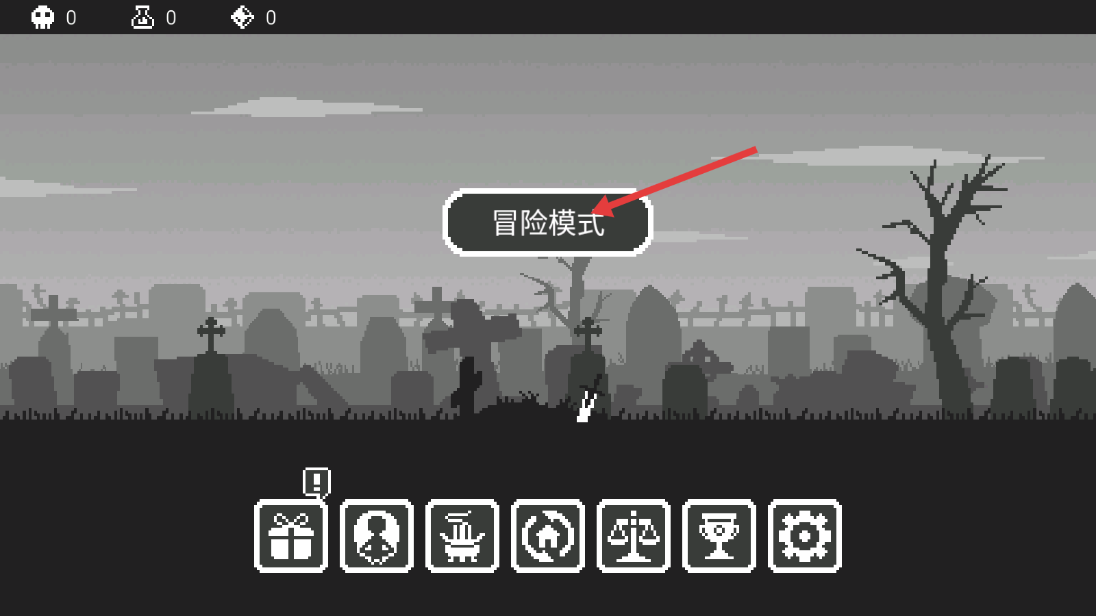 1、进入游戏后点击【冒险模式】,开启冒险征程,探索墓地场景,为后续战斗做好准备。